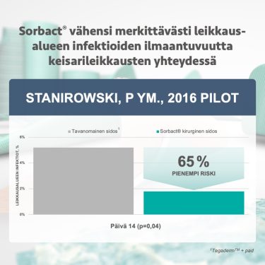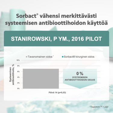 - Leikkausalueen infektioiden osuus päivinä 5–7: 10 % (verrokit) vs. 1 % (Sorbact) p=<0,01